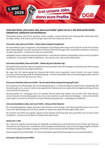 Unter dem Motto "Erst unsere Jobs, dann eure Profite" gehen wir am 1. Mai 2026 auf die Straße - kämpferisch, solidarisch und entschlossen.